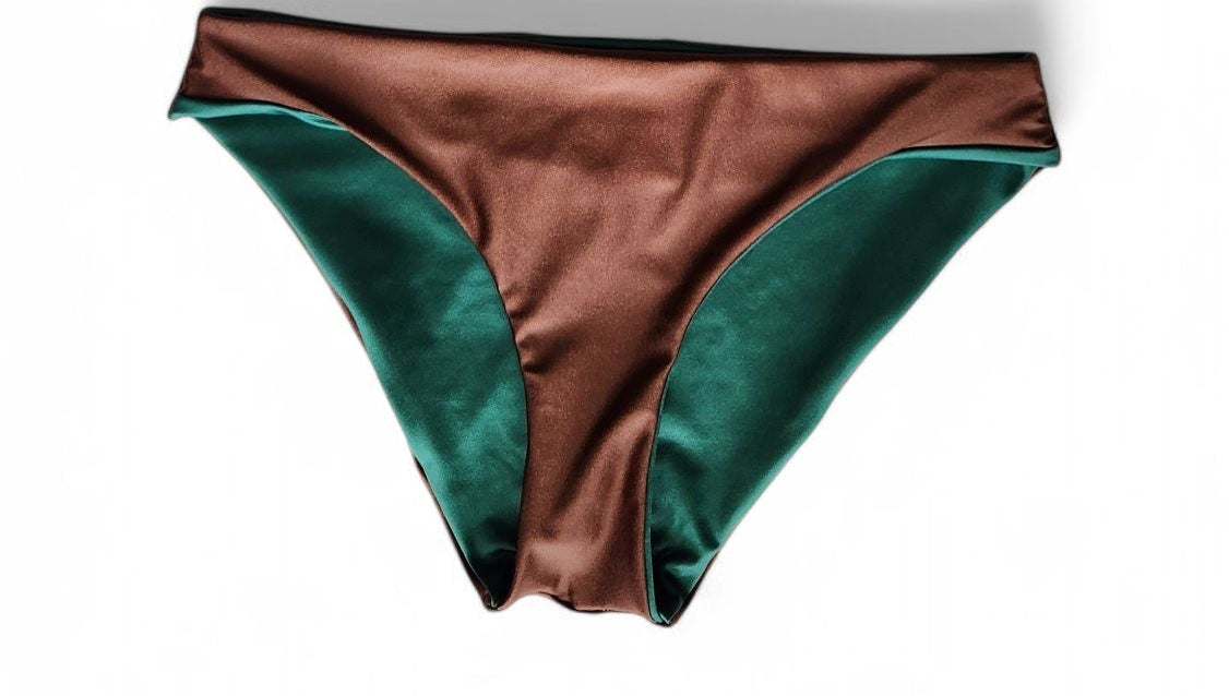Fall head over heels for these delightful Mint Chocolate Reversible Moderate Coverage Cheeky Bikini Bottoms! Offering just the right amount of coverage with a flattering mid to low-cut leg, they flip between rich chocolate and fresh mint shades. Double your fun and style by mixing and matching both colors for endless beach day looks. Dive into comfort and playful vibes with these versatile reversible bikini bottoms!