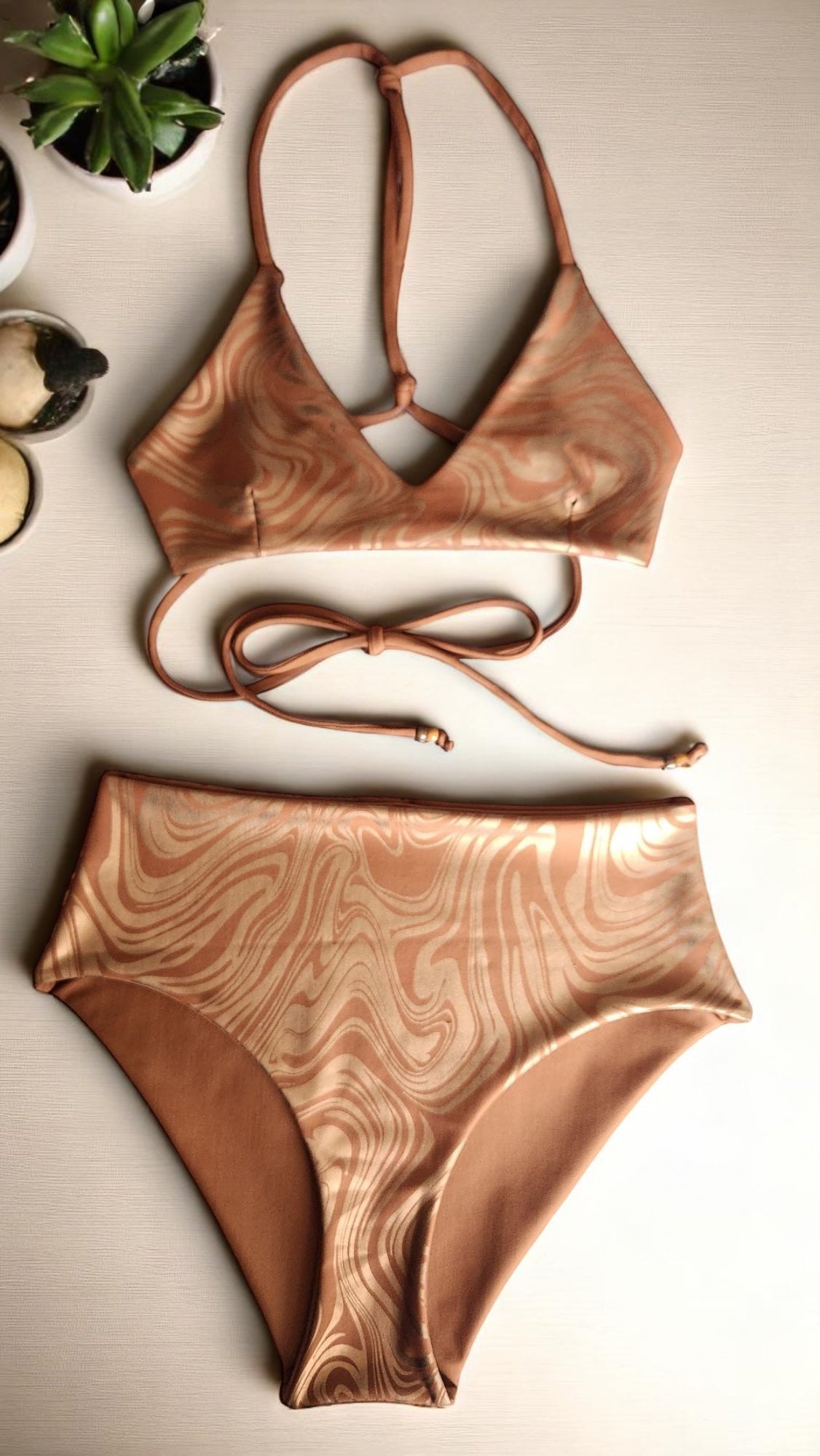 Mocha Mousse Swirl Elise Bikini Top & Reversible High-Waist Palm Beach Bikini Bottoms